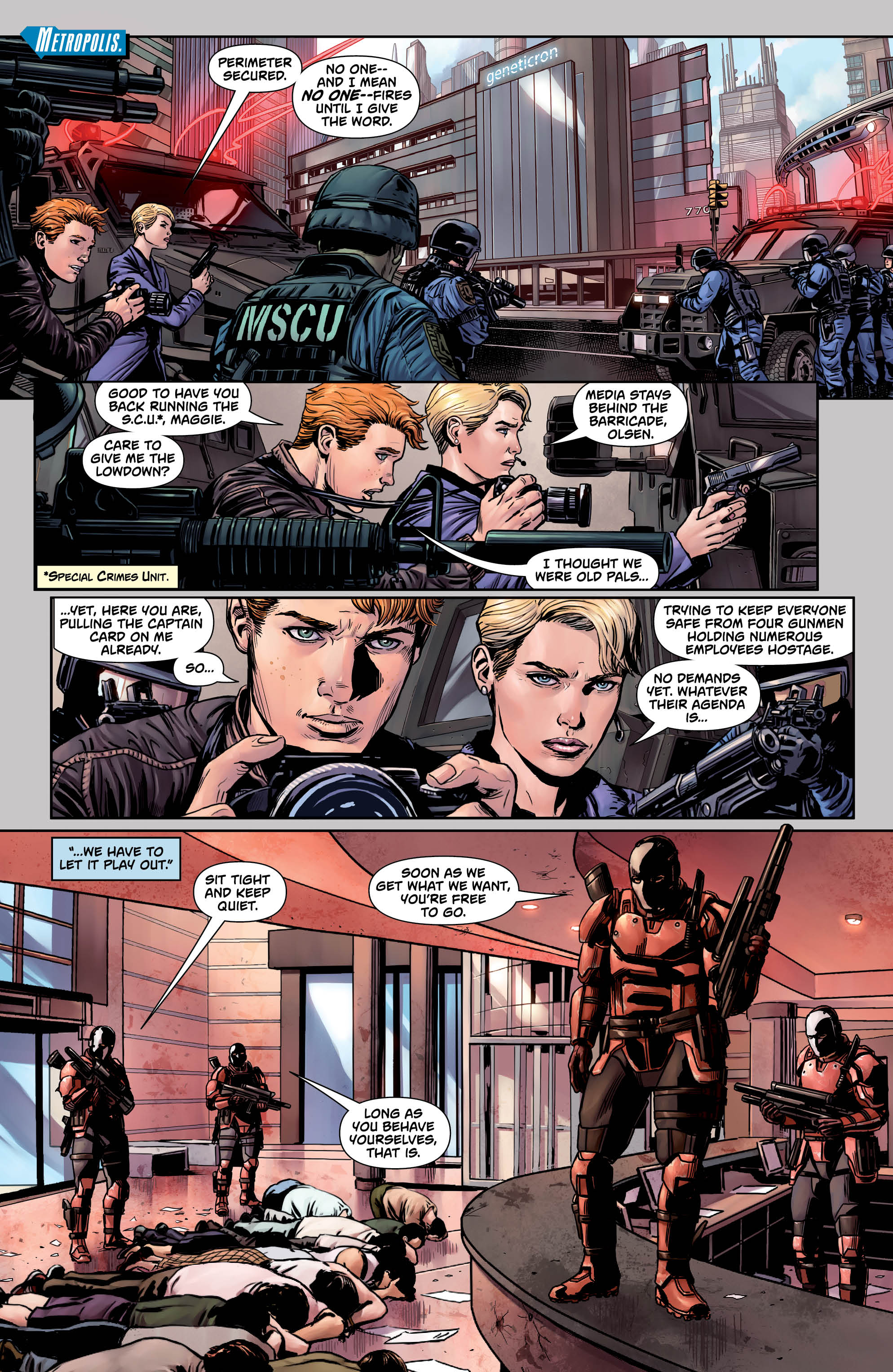 One of my biggest complaints with the main Superman book was that when DC had a chance to do something risky and let the Superman mantle pass to someone new, they instead brought back an emo, post-Death of Superman version of the character from the ’90s. However, this book shows that’s not entirely true. Someone else actually is taking up the Man of Steel’s iconic cape and “S” symbol: Lex Luthor. In and of itself, the move is brilliant. Lex is Superman’s oldest and greatest enemy, the prospect of how he carries on and even bastardizes what Clark stood for is really exciting. Unfortunately, the issue has little time for that because Emo Clark has to swoop in and start a dick measuring contest.