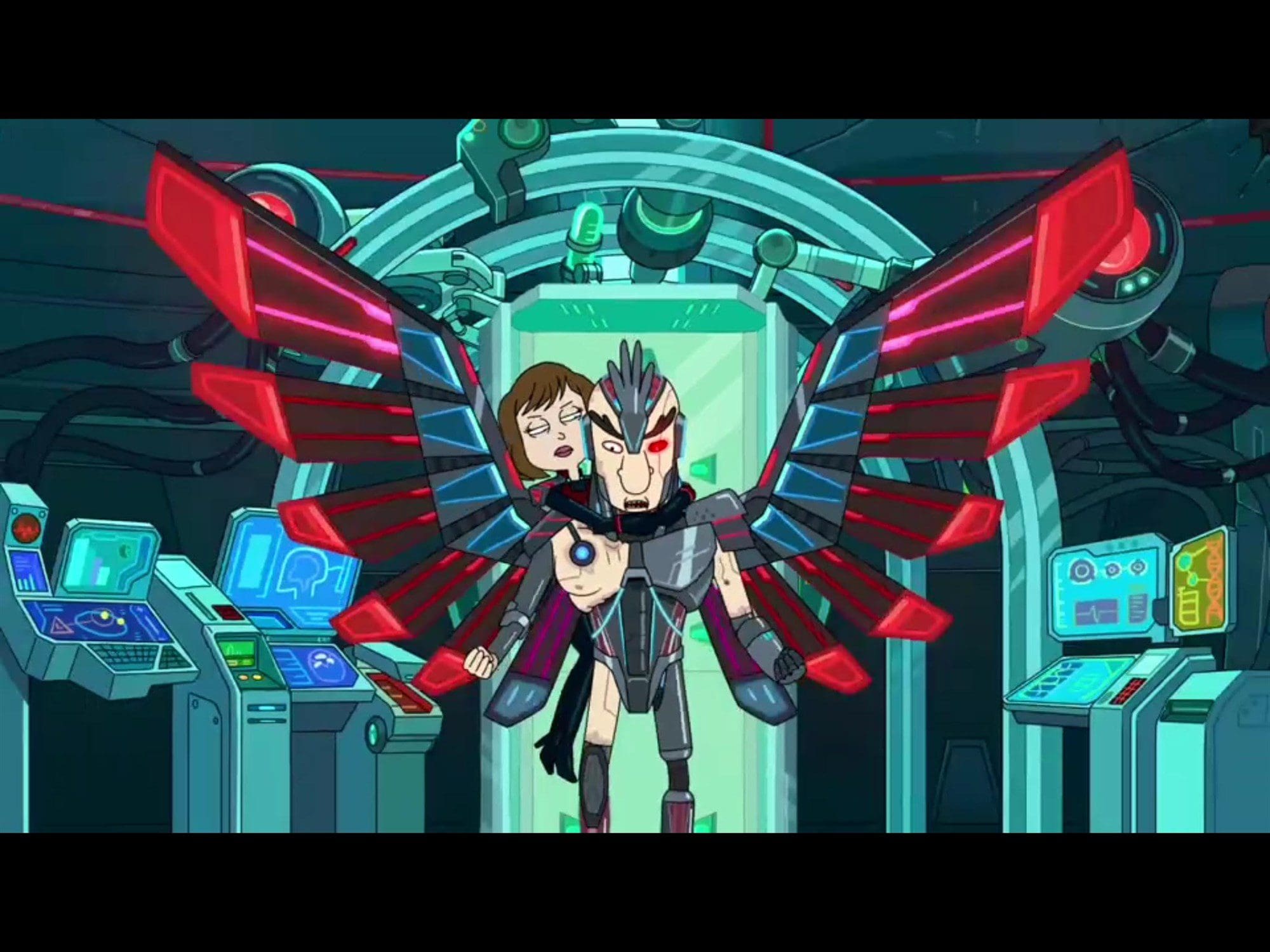 Back in the Brainalyzer Series 9000, C-137 Rick relives the joys of 1998, joys that include McDonald’s promotional Mulan Szechuan dipping sauce, as well as some potentially horrifying revelations. And here’s where the episode’s biggest reveals and questions begin. Rick fabricated a brutally, violent origin story for his portal gun, where an evil interdimensional Rick interferes with a young, pre-portal gun Rick, then murders Diane (Rick’s wife) and child Beth. Thus paradoxically ushering in the cynical, substance-abusing Rick we’ve come to know and love.