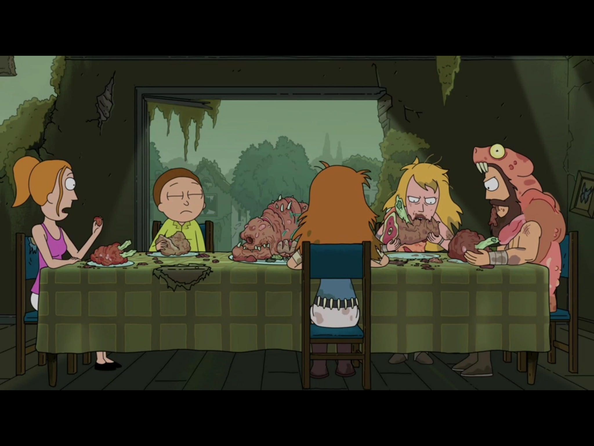 Meanwhile back on Federation occupied Earth, a disgruntled, disillusioned Summer exhumes the dead body of her Rick, replaced at the end of “Rick Potion #9,” stealing his portal gun to spring C-137 (imprisoned) Rick. Morty, in an effort to show Summer the true destruction of Rick and avoid Federal arrest, warps back to his home dimension C-137 (aka Cronenberg world). There they have a run in with the original C-137 Smith family who have turned savage after living in a world overrun with Cronenberg monsters, only then to be captured by the Council of Ricks and leveraged against C-137 Rick.