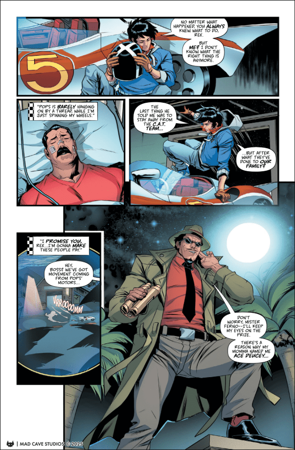 Speed Racer #3 begins by immediately busting into the turf of the nefarious Car Acrobatic Team, their efforts to track down those who sent Pops to the hospital appear to backfire. While the name Car Acrobatic Team doesn’t sound so menacing, C.A.T.’s true motives are more nefarious than meets the eye.Â